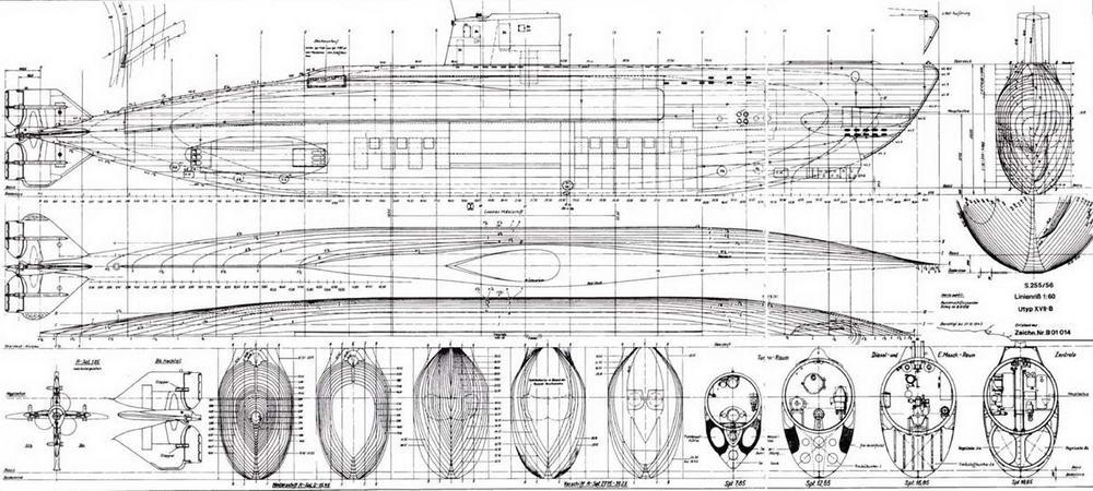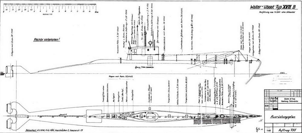 Проект подлодки XVII ВЗ без дизельных моторов предусматривал максимальную скорость под водой 20 узлов. С общим запасом топлива и перекиси водорода 80 т она имел проектную дальность плавания под водой 80 миль/20 узлов + 1700 миль/8 узлов или 2500 миль/8 узлов.