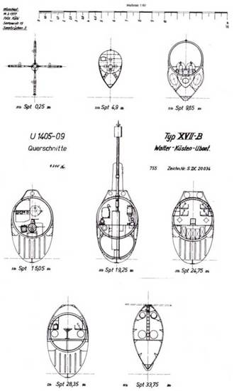 Подлодки проектов XVII Е и XVII В2 имели водоизмещение 340 м³ и длину корпуса 43,9 м. При движении в надводном положении предусматривалось использование дизельного мотора мощностью 900 л.с. При движении под водой силовая установка мощностью 1160 л.с. позволяла достичь скорости 15,7 узлов. На подлодке типа XVII В2 общий вес емкостей для топлива и перекиси водорода составлял 100 т. На подлодке типа XVII Е предполагалось установить большую аккумуляторную батарею, взятую с подлодки серии VII С. Подлодка типа XVII В2 с турбинной установкой Вальтера имела проектную дальность плавания в подводном положении 660 морских миль при скорости 15,7 узлов + 3200 морских миль при скорости 8 узлов или 330 миль/15,7 узлов + 1600 миль/8 узлов (с учетом возврата на базу). Для подлодки проекта XVII Е дальность плавания в подводном положении в зависимости от скорости была следующей: 19 миль/ 15,7 узлов или 53 мили/ 10 узлов или 132 мили/6 узлов или 20 миль/2 узла. В надводном положении дальность плавания для обеих проектов составляла 5400 миль/8 узлов или 3800 миль/10 узлов.