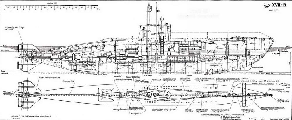 Проект подлодки XVII А с турбиной мощностью 7500 л.с. и боковыми торпедными аппаратами имел следующие данные: