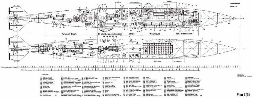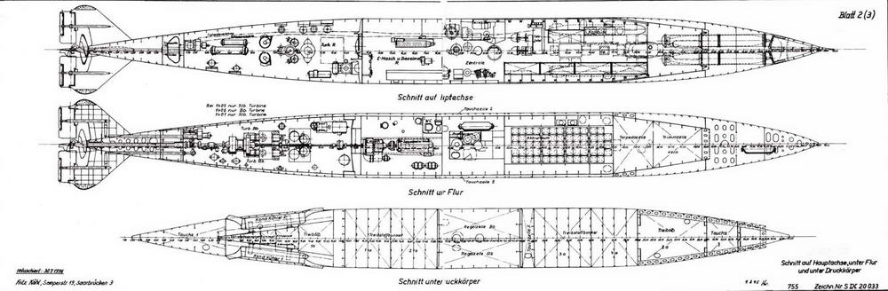 турбина мощностью 3000 л.с турбина мощностью 7500 л с компрессором с компрессором 157/21 84/28 129/24 129/24 203/16 167/20 219/13 200/16 220/11 215/13Альтернативный вариант с турбиной мощностью 7500 л.с. вызвал большой интерес у комиссии подводных лодок кригсмарине и было предложено продолжить работы по ее созданию. При этом было выдвинуто требование о новом вооружении с минимальным запасом десяти 7-м торпед и двух вариантах установки: шеститрубные торпедные аппараты в носовой части (как у подлодок XXI серии) с 4 запасными торпедами или размещение 4 носовых и 6 боковых торпедных аппаратов, расположенных в средней части корпуса и направленных на корму, при этом запасных торпед не предусматривалось. По замыслу конструкторов в этом случае можно было произвести ряд залпов по различным целям, в том числе при отходе. Такое расположение торпедных аппаратов было связано с ограниченными запасами перекиси водорода на борту, а значит, и с ограниченным временем работы турбины Вальтера.