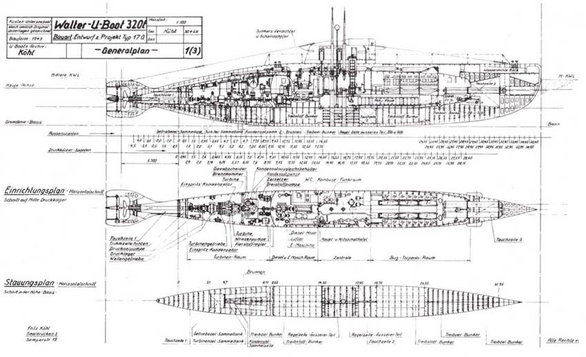 После принятия решения о постройке подлодки XXII серии доктор Фишер представил 5 августа 1943 г. проект увеличенной версии подлодки, получивший обозначение XVII А. Она была оснащена турбиной мощностью 3000 л.с., что позволяло развить максимальную скорость иод водой в 21 узел и достичь дальности плавания 168 миль /21 узел или 216 миль/12 узлов. Для обычной силовой установки был предусмотрен на выбор дизельный или дизель-электрический вариант с дизельным мотором мощностью 400 л.с. MWM RS 125. В качестве альтернативы предлагалась установка турбины мощностью 7500 л.с. (используемой на подлодке XVIII серии) и силовая дизель-электрическая установка, проектная максимальная скорость такой подлодки под водой была 28 узлов.