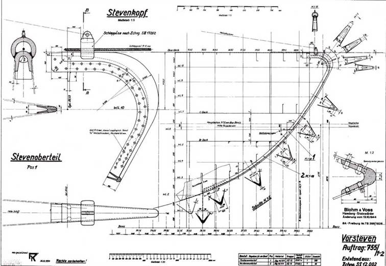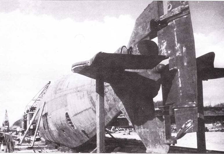 Носовая часть U 792 после подъёма на оборудованной набережной «Говальд-Верке» в Киле.