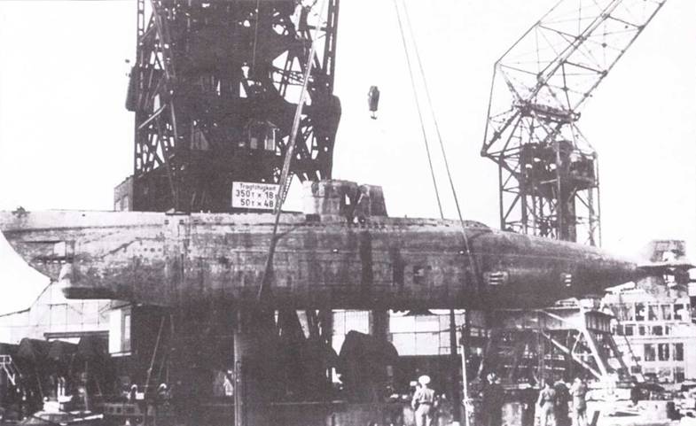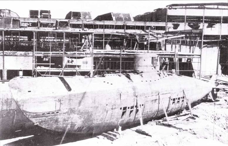 U 793 на «Говальд-Верке» в Киле. Она незначительно отличалась от U 792 числом шпигатов в средней чисти корпуса. Передний стабилизатор в развернутом положении сверху корпуса. Желтая опознавательная полоса на верхнем крае рубки ещё заметна.