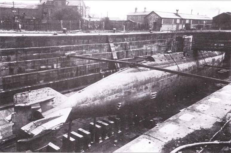 U 1407 после переправки в Англию в сухом доке. Обшивка в районе мачт для подвода и отвода воздуха, а также в районе выхлопных патрубков демонтирована.