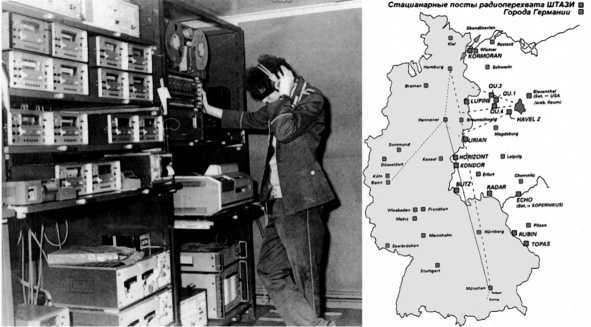 Пост радиоконтроля Штази и схема их размещения на территории Германии (из архива Detlev Vreisleben Collection)