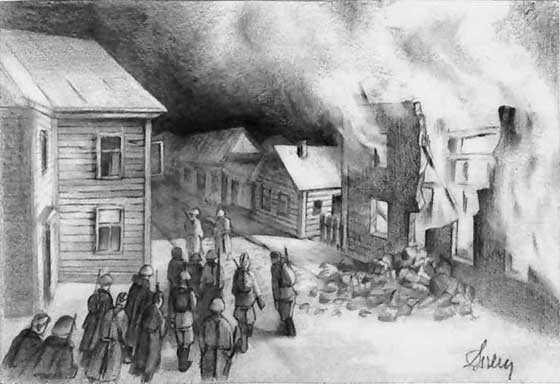 Город был брошен. Людей на улицах не было видно. Где искать нам дорогу? Куда поворачивать? И куда вообще нам идти? Мы стояли и смотрели на пылающие дома. Огромные чёрные клубы дыма, они как гигантских размеров шары, переваливались, крутились, и медленно уползали вверх. Не слышно было ни грохота, ни стрельбы. Потрескивали и шипели объятые пламенем деревянные переборки домов. В воздухе стоял противный запах гари. Под ногами, на мостовой, серый слой лёгкого пепла. Прошёл по нему первым, видны твои следы. Летящая сверху гарь и зола оседает у тебя на плечах и на каске. Яркие искры и горящие огоньки углей носятся в воздухе и сверкают на темном фоне пространства.