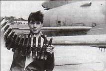 Курсант Ейского училища у самолета Су-17 с патронной лентой, снаряженной 30-мм осколочно-фугасно-зажигательными снарядами для пушек НР-30