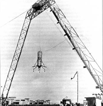 Установка С.450 в вертикальное положение при помощи гидроподъемника (слева). Испытания системы отклонения вектора тяги