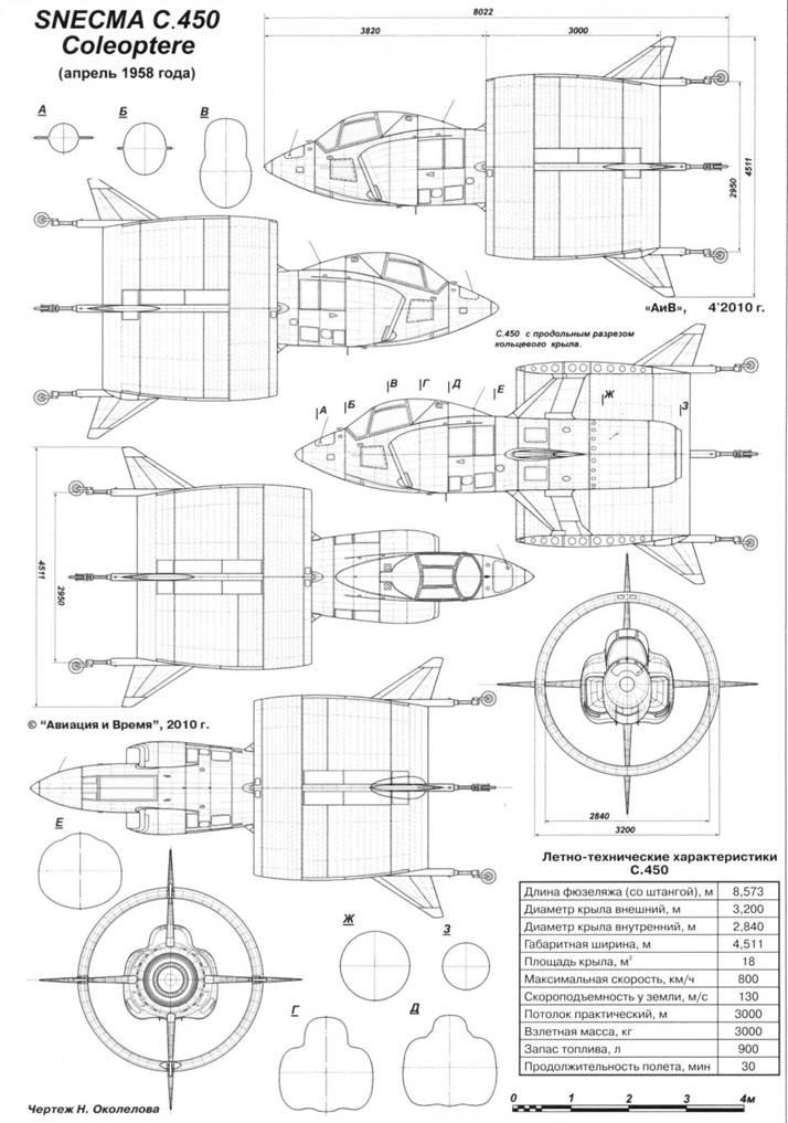 Пока специалисты по двигателю и системе управления доводили свои разработки «до ума», Зборовский работал над прототипом «Колеоптера» с обозначением С.450. Самолет имел кольцевое крыло асимметричного профиля с относительной толщиной около 6%. Внешний диаметр крыла – 3,2 м, хорда – 3 м, площадь – 18 м2 .
