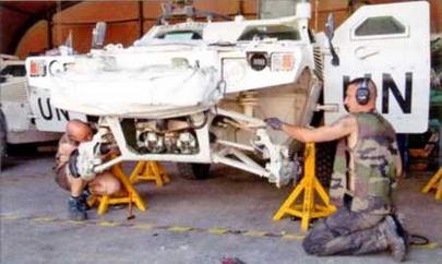 Ремонт бронеавтомобиля VBL из состава "сил ООН". Хорошо видны передние узлы подвески и агрегаты трансмиссии.