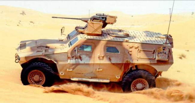 Бронеавтомобиль VBR с 20-мм автоматической пушкой на дистанционно-управляемой турели "Некстер" ARX20, в пустынной камуфляжной окраске. Для увеличения проходимости давление воздуха в шинах уменьшено с помощью централизованной системы регулировки.