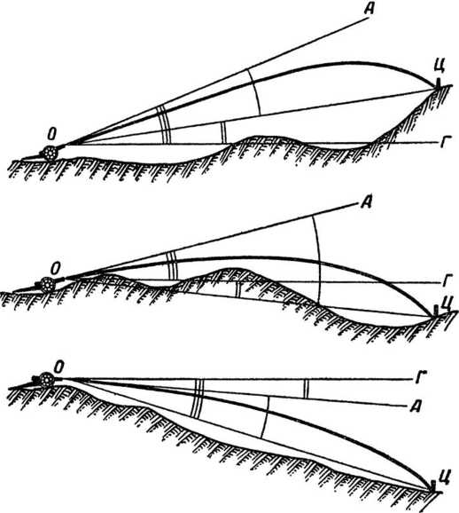Допустим, что цель выше горизонта. Легко понять, что если мы придадим орудию угол возвышения, равный углу прицеливания, то снаряд не долетит до цели. Если цель будет ниже линии горизонта, то снаряд перелетит через цель. Ошибка в том и другом случае объясняется тем, что не принят во внимание угол между линией цели и линией горизонта орудия ОГ, который называется углом места цели. Угол места цели может быть положительным (если цель выше линии горизонта орудия) и отрицательным (если цель ниже этого горизонта). Следовательно, угол возвышения орудия всегда должен быть равен алгебраической сумме угла прицеливания и угла места цели. Поэтому на орудийном прицеле имеются и механизм углов прицеливания и механизм углов цели.