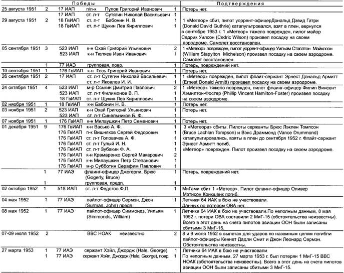 Со времени последней встречи советских и австралийских пилотов 1 декабря 1951 г. прошло десять месяцев. За это время ушли в Союз 303-я и 324-я ИАД, отработали и вернулись домой их преемники – 97-я и 190-я ИАД. Сейчас в Корее сражались 32-я, 133-я и 216-я дивизии. Летчикам последней и довелось встретиться с «Метеорами».