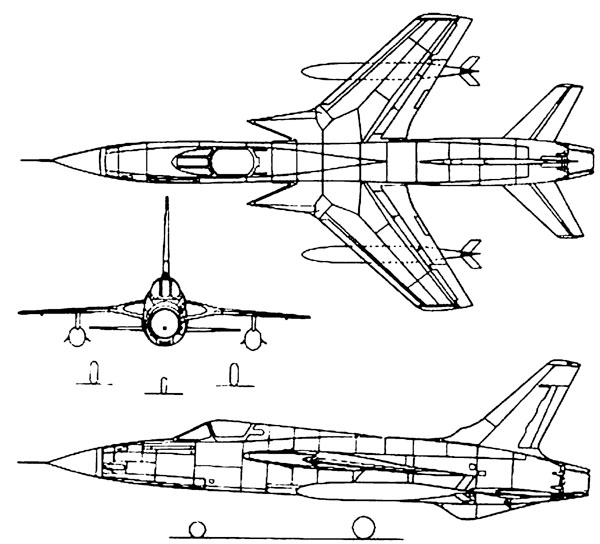 В этом проекте явно просматривалась эволюция предыдущих разработок Картвели. Среднеплан с низким цельноповоротным горизонтальным оперением. Очень большое удлинение фюзеляжа. Крыло и оперение – стреловидные. Крыльевые воздухозаборники его стреловидного разведчика теперь получили сверхзвуковую геометрию, обеспечивающую минимальную интенсивность скачков уплотнения, и играют роль переднего наплыва крыла. При переходе на сверхзвук их доля в создании подъёмной силы увеличивается, и смещение фокуса самолёта назад уменьшается.