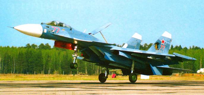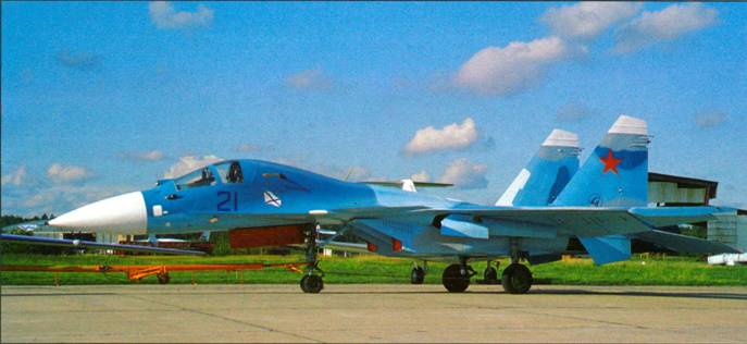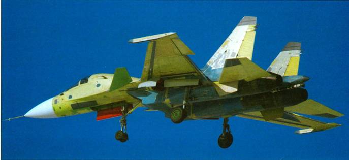 Су-27КУБ в середине 1999 г. (сверху) и в августе 2001 г. На верхнем фото видно отличие его от Су-33: все новые элементы конструкции самолета имеют желто-зеленый цвет авиационной грунтовки