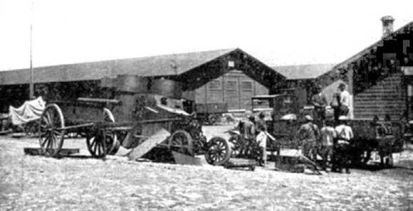 Артиллерийская платформа бронепоезда «1-й Боевой поезд» с 3-х дюймовым орудием на деревянном поворотном круге, обеспечивающем обстрел 3600.