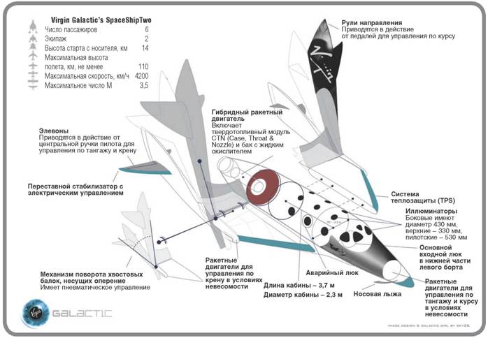 для двух пассажиров. Двигательная установка состояла из одного гибридного ракетного двигателя SpaceDev Hybrid с тягой 7500 кгс и временем работы 87 с, использующего в качестве компонентов топлива окисел азота (N2O) и гидроксильный полибутадиен (HTPB). В ходе испытаний на SS2 была достигнута скорость полета, соответствующая числу М=3,09, максимальная высота полета 112 км и максимальная скороподъемность 416,6 м/с.