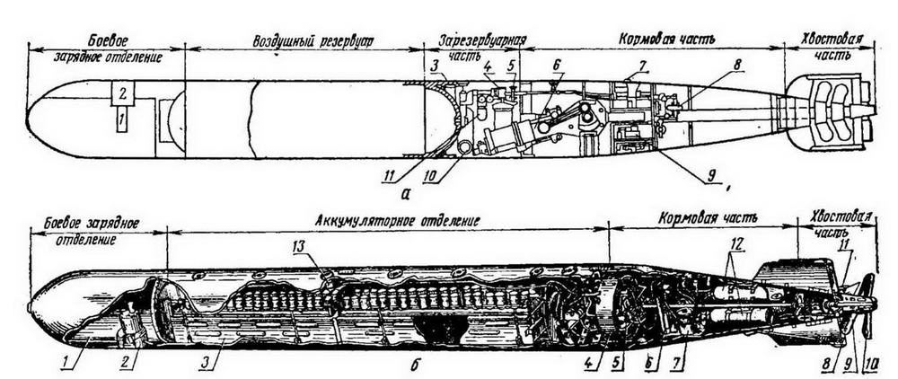 б — электрическая: 1 —взрывчатое вещество; 2 — взрыватель; 3 — аккумуляторы; 4 — электродвигатели; 5 — пусковой контактор; 6 — гидростатический прибор; 7 — гироскопический прибор; 8 — вертикальный руль; 9 — передний винт; 10 — задний винт; 11 — горизонтальный руль; 12 —баллоны со сжатым воздухом; 13 — прибор для сжигания водорода