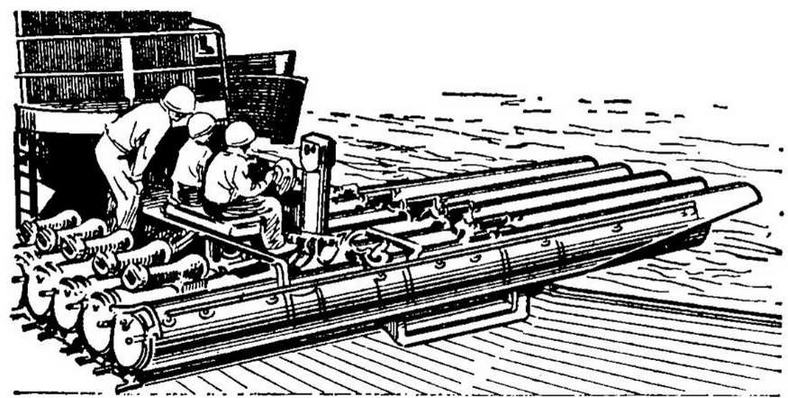 В современных условиях вероятность применения торпед надводными кораблями против надводных кораблей значительно снизилась вследствие появления грозного ракетного оружия. Вместе с тем способность некоторых классов надводных кораблей — тЬрпедных катеров и эскадренных миноносцев — наносить торпедный удар еще представляет для кораблей и транспортов угрозу и ограничивает их зону возможного маневрирования. В то же время торпеды становятся все более и более важным средством борьбы с подводными лодками. Вот почему за последние годы в военно-морских силах многих иностранных государств большое значение придается противолодочным торпедам (рис. 23), которыми вооружаются авиация, подводные лодки и надводные корабли.