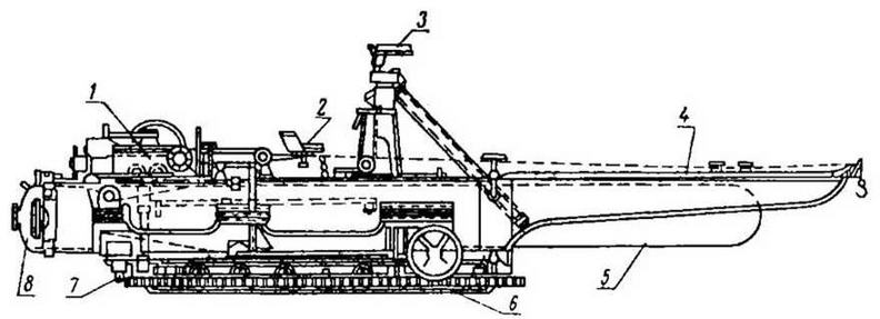 1 — прибор для управления вращением торпедного аппарата; 2 — место для наводчика; 3 — аппаратный прицел; 4 — труба торпедного аппарата; 5 - торпеда; 6 — неподвижное основание; 7 — поворотная платформа; 8 — крышка торпедного аппарата