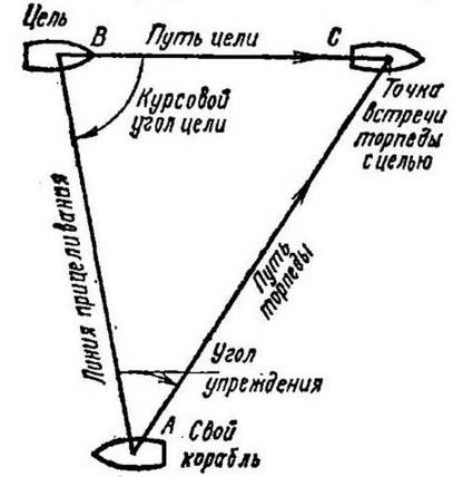 Рис. 21. Схема стрельбы торпедой по движущейся цели (торпедный треугольник)