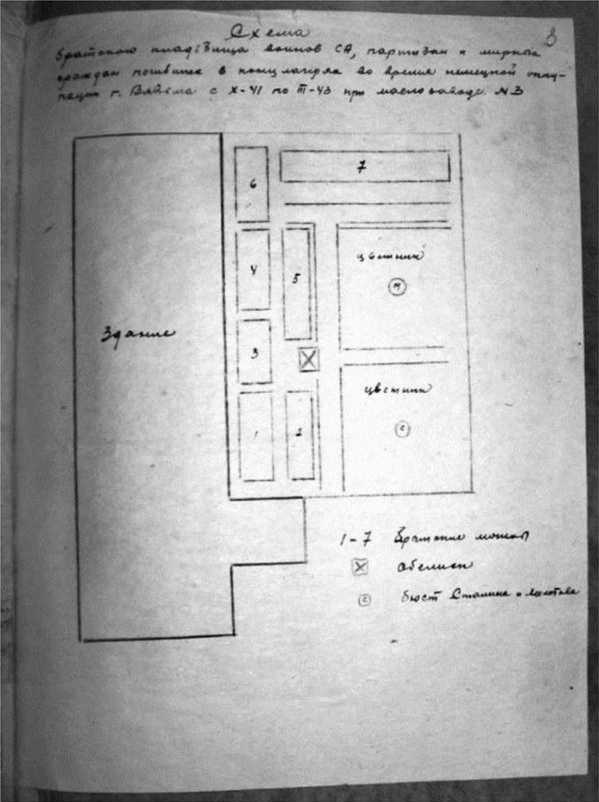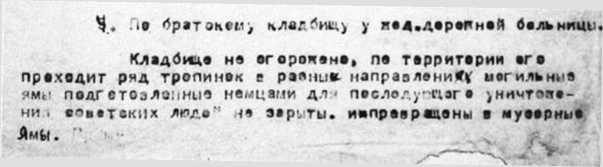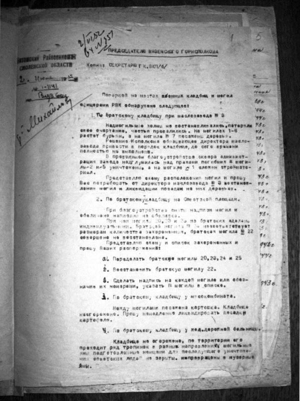 Согласно документам, после освобождения г. Вязьмы в районе лазарета № 1 находилось 37 погребальных рвов с останками погибших. Состояние их длительное время было неблагополучным. Вяземский военком полковник Васильев в своем письме от 2 июня 1952 г. № 1-1141 в адрес председателя Вяземского горисполкома о состоянии братского кладбища у железнодорожной больницы с беспокойством сообщает: «Проверкой на местах военных кладбищ и могил офицерами РВК обнаружено следующее:…4. По братскому кладбищу у железнодорожной] больницы. Кладбище не огорожено, по территории его проходит ряд тропинок в разных направлениях, могильные ямы, подготовленные немцами для последующего уничтожения советских людей, не зарыты и превращены в мусорные ямы. Прошу немедленно заровнять ямы и не допускать кладбище к засорению нечистотами. Приложение: схемы две штуки только председателю горисполкома, Вяземский райвоенком — полковник Васильев».