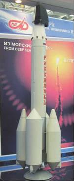 В экспозиции ГРЦ был представлен и макет нового варианта РН комплекса «Воздушный старт», ступени которого – в отличие от предыдущей конфигурации – выполнены в одном диаметре (2,66 м). Причиной такого решения является стремление использовать технологическую оснастку блока «И» (третья ступень РН «Союз»), имеющуюся на самарском заводе «Прогресс». Посетители салона также смогли увидеть макет «старой» РН семейства «Штиль», созданной на основе БРПЛ.
