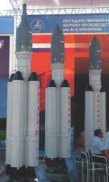ГКНПЦ им. М.В. Хруничева показал макеты линейки РН семейств «Ангара» и «Протон». Эти ракеты давно знакомы специалистам и знатокам аэрокосмической техники. Однако и здесь не обошлось без новинок в виде двухступенчатой РН «Ангара-5П», предназначенной для выведения на орбиту пилотируемого комплекса, разрабатываемого Центром на основе задела по пилотируемым кораблям ТКС, и целых трех разных вариантов легкой РН «Ангара-1» (на фото в середине).
