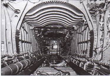 Слева — термоядерная бомба Мк.43 с приспособлением для загрузки в бомбоотсек. Справа — «ядерный туннель» и бомбоотсек (вид по полету)