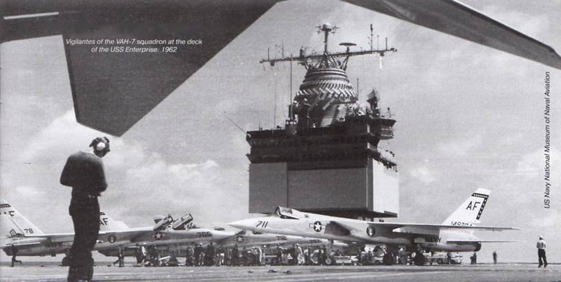 VAH-7 первый «Виджилент» получила 25 января 1962 г, и в феврале летчики эскадрильи приступили к тренировочным полетам с палубы атомного авианосца Enterprise (CVN-65). К августу подразделение было подготовлено в полном объеме, после чего отправилось в «средиземноморский круиз- на борту того же корабля. Поход завершился довольно скоро — 11 октября. Причиной стал Карибский кризис, и «Энтерпрайз» был направлен в восточную Атлантику для усиления группировки на случай разрастания конфликта. Состоявшийся в 1963 г. второй поход этой эскадрильи на «Энтерпрайзе» в Средиземноморье растянулся уже на 7 месяцев.