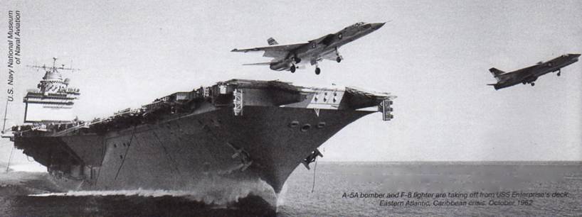 Бомбардировщик А-5А взлетает с палубы «Энтерпрайза» вместе с истребителем F-8. Восточная Атлантика, Карибский кризис, октябрь 1962 г.