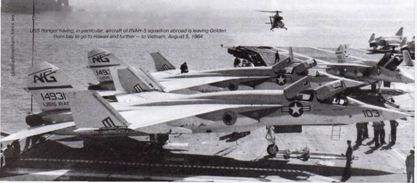 эскадрилья авианосец поход начало конец RVAH-5 CVA-61 05.08.1964 06.05.1965 RVAH-1 CVA-62 10.05.1965 13.12.1965 RVAH-13 CVA-63 19 10 1965 13 06.1966 RVAH-7 CVAN-65 26.10 1965 21.06.1966 RVAH-9 CVA-61 10.12.1965 25.08.1966 RVAH-6 CVA-64 12.05.1966 03.12.1966 RVAH-13 CVA-63 05.11.1966 20.06.1967 RVAH-7 CVAN-65 19.11.1966 06.07.1967 RVAH-12 CVA-64 29.04.1967 04.12.1967 RVAH-1 1 CVA-59 06.06.1967 14.09.1967 RVAH-6 CVA-61 04.11.1967 25.05.1968 RVAH-1 1 CVA-63 08.11.1967 28.06.1968 RVAH-1 CVAN-65 03.01.1968 18 07.1968 RVAH-13 CVA-66 10.04.1968 16.12.1968 RVAH-5 CVA-64 29.05.1968 31 01.1969 RVAH-9 CVA-61 26.10.1968 17 05.1969 RVAH-1 1 CVA-63 30.12.1968 14.09.1969 RVAH-6 CVAN-65 09.01.1969 02.07.1969 RVAH-7 CVA-64 11.08.1969 08 05.1970 RVAH-5 CVA-64 14.11.1969 01.06.1970. RVAH-12 CVA-66 10.04.1970 21.12.1970 RVAH-1 CVA-61 27.10.1970 17.06.1971 RVAH-6 CVA-63 06.11.1970 17.07.1971 RVAH-5 CVAN-65 11.06.1971 12 02 1972 RVAH-1 1 CVA-64 01.10.1971 30 06.1972 RVAH-7 CVA-63 17.02.1972 28.11.1972 RVAH-1 CVA-60 11.04.1972 13 02 1973 RVAH-6 CVA-66 05.06.1972 24.03.1973 RVAH-13 CVAN-65 12.09.1972 12 06.1973 RVAH-5 CVA-61 16.11.1972 22 06.1973 RVAH-12 CVA-64 05 01 1973 11.10.1973 RVAH-12 CVAN-65 17.09.1974 20.05.1975В итоге
