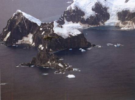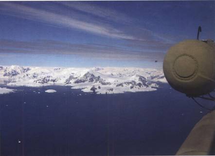 На высоте около 2400–2800 м попали в зону слабого обледенения, на высоте 3100 м вышли за облака. Определили ветер — боковой со скоростью 45 км/час, приняли решение о продолжении полета на эшелоне. Второй экипаж приступил к набору высоты. Заняли безопасный эшелон (в этом районе он 3300 м) и взяли курс на остров Кинг-Джордж. Полет проходит спокойно, прогноз погоды полностью оправдывается. За 230 километров появился визуальный контакт с белым материком — Антарктидой. Облачность все ниже и тоньше. Вблизи островов Антарктиды начали появляться небольшие айсберги, облачность практически пропала.