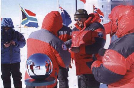 Мы подняли на Южном полюсе флаг России, совершили несколько «кругосветных путешествий» вокруг столба с зеркальным шаром, установленного в точке полюса. Торжественное завершение дня — вручение участникам перелета знаков Управления авиации ФСБ «Золотой орел». Это знак признания наивысшего профессионального мастерства.