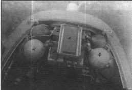 Общий вид размещения агрегатов спецоборудования в носовой части фюзеляжа: 1-рамка РПК; 2-приемник РПК; 3-аккумуляторная батарея; 4-кислородные баллоны
