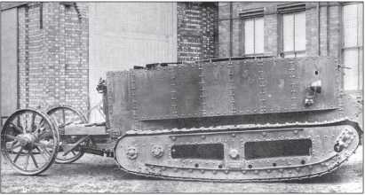 «Маленький Вилли» на заводском дворе, ноябрь 1915 г. Обратим внимание на ходовую часть с жесткой подвеской, колесный «хвост» и крышу, перекрывающую предусмотренное поначалу отверстие под вращающуюся башню.