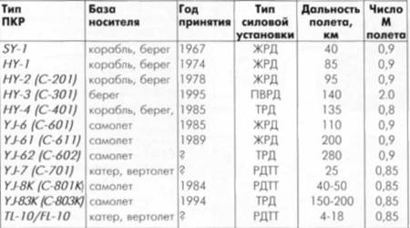 Использование в качестве силовой установки прямоточного воздушно-реактивного двигателя (ПВРД) на противокорабельной крылатой ракете HY-3 (экспортное обозначение С-301) позволило увеличить скорость полета до величины, соответствующей числу М=2,0, а дальность полета до 140 км. Дозвуковая ракета HY-4, оснащенная турбореактивным двигателем (ТРД), имеет дальность полета 135 км. Наибольшую дальность полета (200 км) среди ракет с ЖРД имеет ПКР YJ-61 (С-611), принятая на вооружение НОАК в 1989 г.