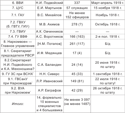 Начатое еще при прежнем руководстве Наркомвоена сворачивание подразделений бывшего Военного министерства фактически завершилось. Более того, анализ численности старых служащих аппарата показывает, что в марте – июле 1918 года была реформирована, по сути, лишь верхушка центрального военного аппарата – служащие его старых структур после реорганизации стали служащими новых.