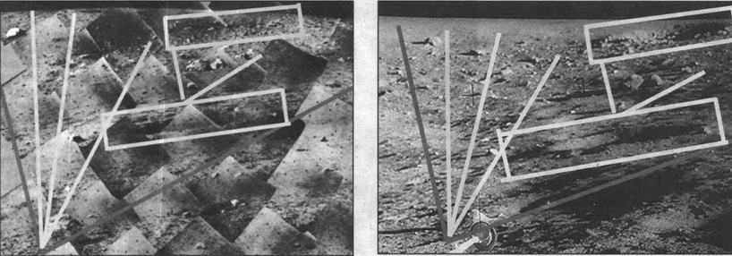 Фотографии одного и того же участка Луны, сделанные с Surveyor-З (слева) и Apollo 12 (справа) с отметкой характерных элементов