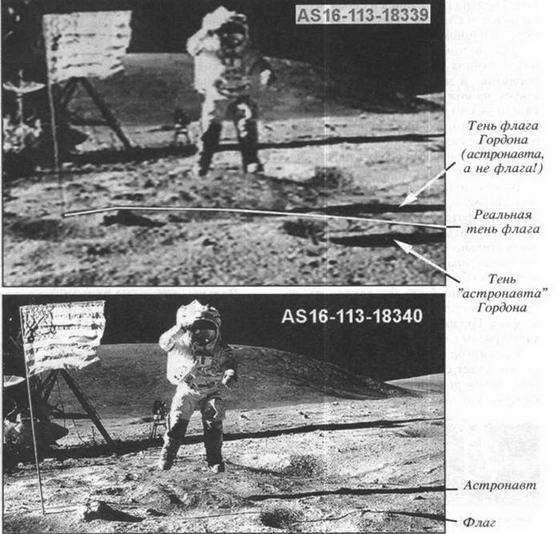 Но авторы фильма "проводят" линию тени флага по реальной тени астронавта, а тени самого астронавта "предначертывают" быть на переднем плане, где ее, разумеется, нет.