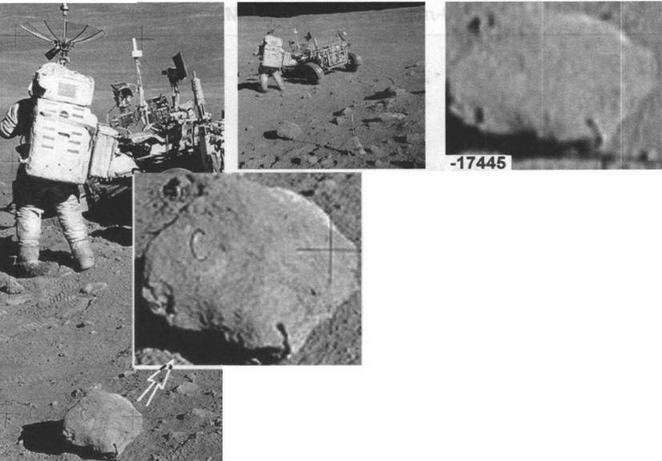 В левой верхней четверти – пилот LM астронавт Чарли Дюк рядом с луноходом (ровером), а слева, почти у нижней кромки кадра, здоровый камень, на котором явно рукой фотомаркировщика написана буква "С.", да – именно с точкой. С этой буквой он так теперь и печатается в дорогих альбомах, на радость любителям разоблачений.