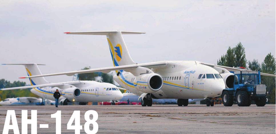 Первый серийный Ан-148-100В киевской сборки и опытный Ан-158 (на заднем плане) на аэродроме «Киев-Антонов» в Гостомеле, 2 октября 2010 г.