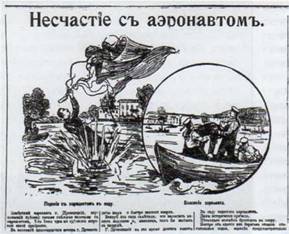 На высоте трех-четырех метров аэронавт оторвался от шара (возможно, он сделал это намеренно, заметив какие-то неполадки с монгольфьером) и вместе с нераскрытым парашютом, как писала газета, «всей тяжестью тела грохнулся об землю, ударившись еще и головой о столб». Дымящий и быстро терявший форму шар понесся низко над землей и бесформенной массой упал у самых ворот аэродрома.