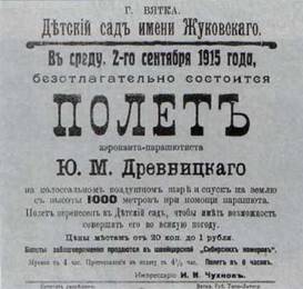О его полете в Новороссийске 1 декабря газета «Черноморский край» писала: «Управляемый парашют – изобретение Ю.М.Древницкого – является последней технической новостью в деле воздухоплавания. До сего времени парашютисты с момента отделения от шара предоставляли себя на волю ветра и не могли опуститься там, где хотели бы.