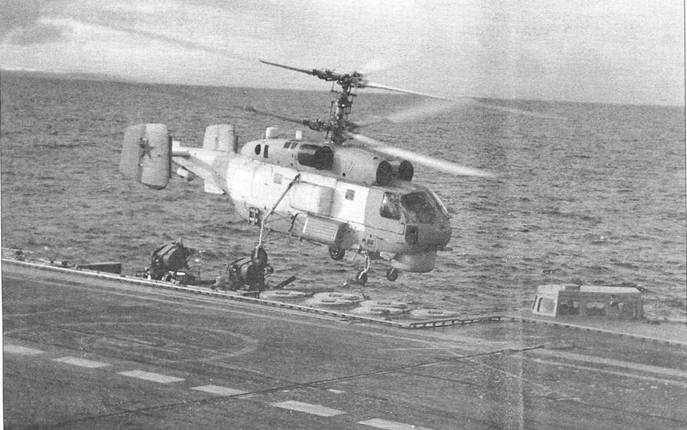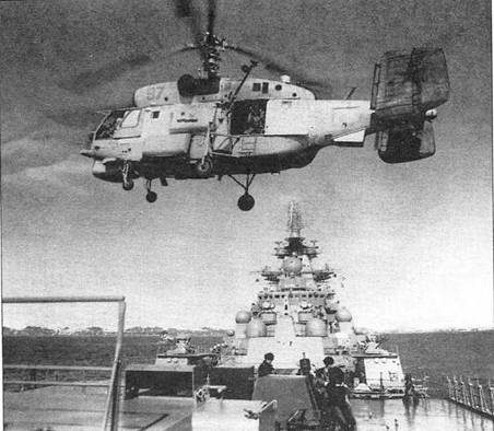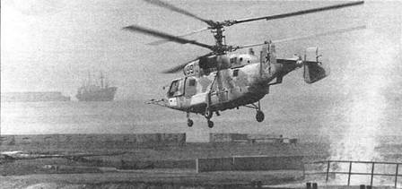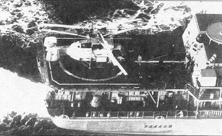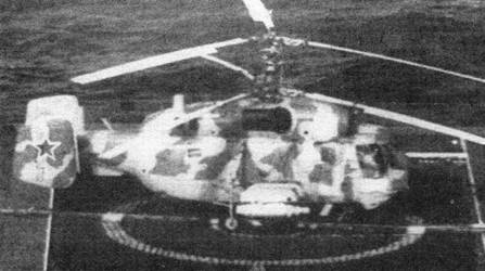 Один из первых снимков Ка-29ТБ. попавших в западную печать; вертолет, вооруженный блоками НУРС УБ-32А, показан на палубе большого десантного корабля (БДК) "Иван Рогов". (Архив С. Д. и Д. С. Комиссаровых)