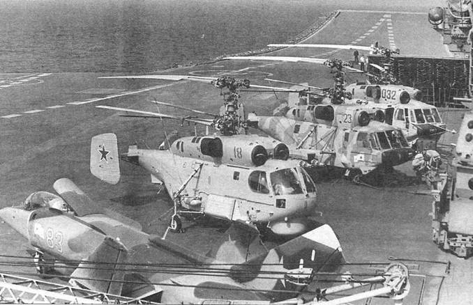 Серийные Ка-27ПЛ (борт 18-красный), Ка-29ТБ (борт 23-красный) и второй прототип Ка-31 (борт 032-чер- ный) на палубе ТАКР Тбилиси" (ныне "Адмирал флота Советского Союза Кузнецов") во время Государственных испытаний последнего, август 1990 г. Любопытен также истребитель Як-38М (борт 38-желтый) в необычном трехцветном камуфляже. (ИТАР-ТАСС)