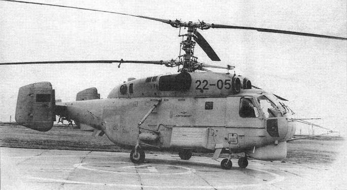 Один из опытных экземпляров Ка-252 с необычным чёрным бортовым номером 22-05 (по зав. № 02205). баллонетами и приборной штангой на носу. Держатель под хвостовой балкой, вероятно, служил для крепления гондолы магнитометра. Расположение антенн соответствует серийным экземплярам. Любопытно, что вертолёт несёт советский флаг на килях и логотип Аэрофлота на борту вместо опознавательных знаков ВВС. (Архив С. Д. и Д. С. Комиссаровых)