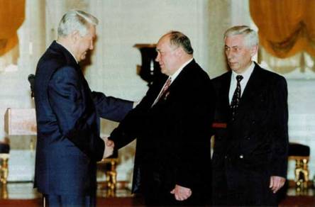 Президент Российской Федерации Б.Н. Ельцин вручает С.В. Михееву Золотую Звезду Героя