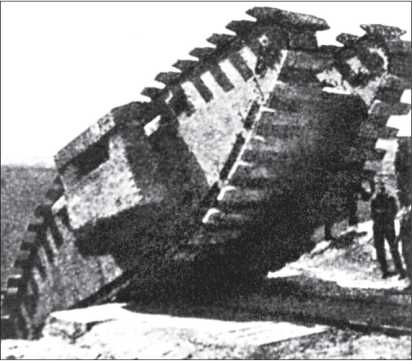 Танк Mk II «самка» с деревянными брусками на траках гусениц отрабатывает подъем по аппарели в ходе подготовки к «Тихой операции» (так и не состоявшейся).