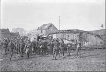 Погрузка раненого (возможно — танкиста) в санитарный автомобиль. Рядом — танк Mk IV «самка». А мимо марширует пехота.